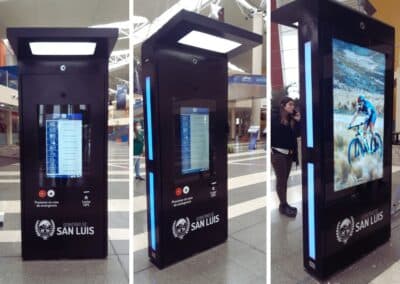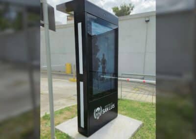 Diseñada para funcionalidades multitarea en espacios públicos, como puntos de información y gestiones civiles al aire libre, esta terminal resistente cuenta con dos pantallas: una de 55 pulgadas para cartelería digital y otra de 32 pulgadas con tecnología touchscreen resistente a la lluvia y humedad.